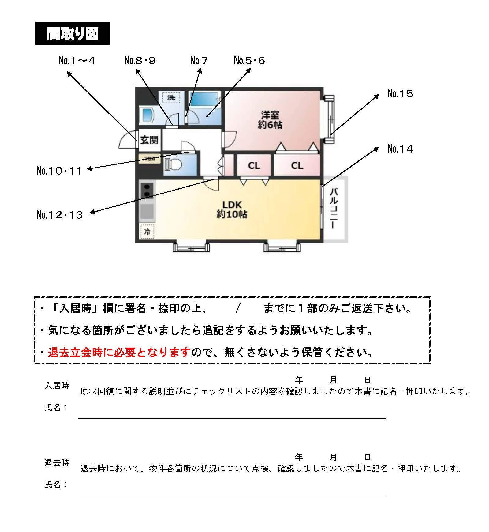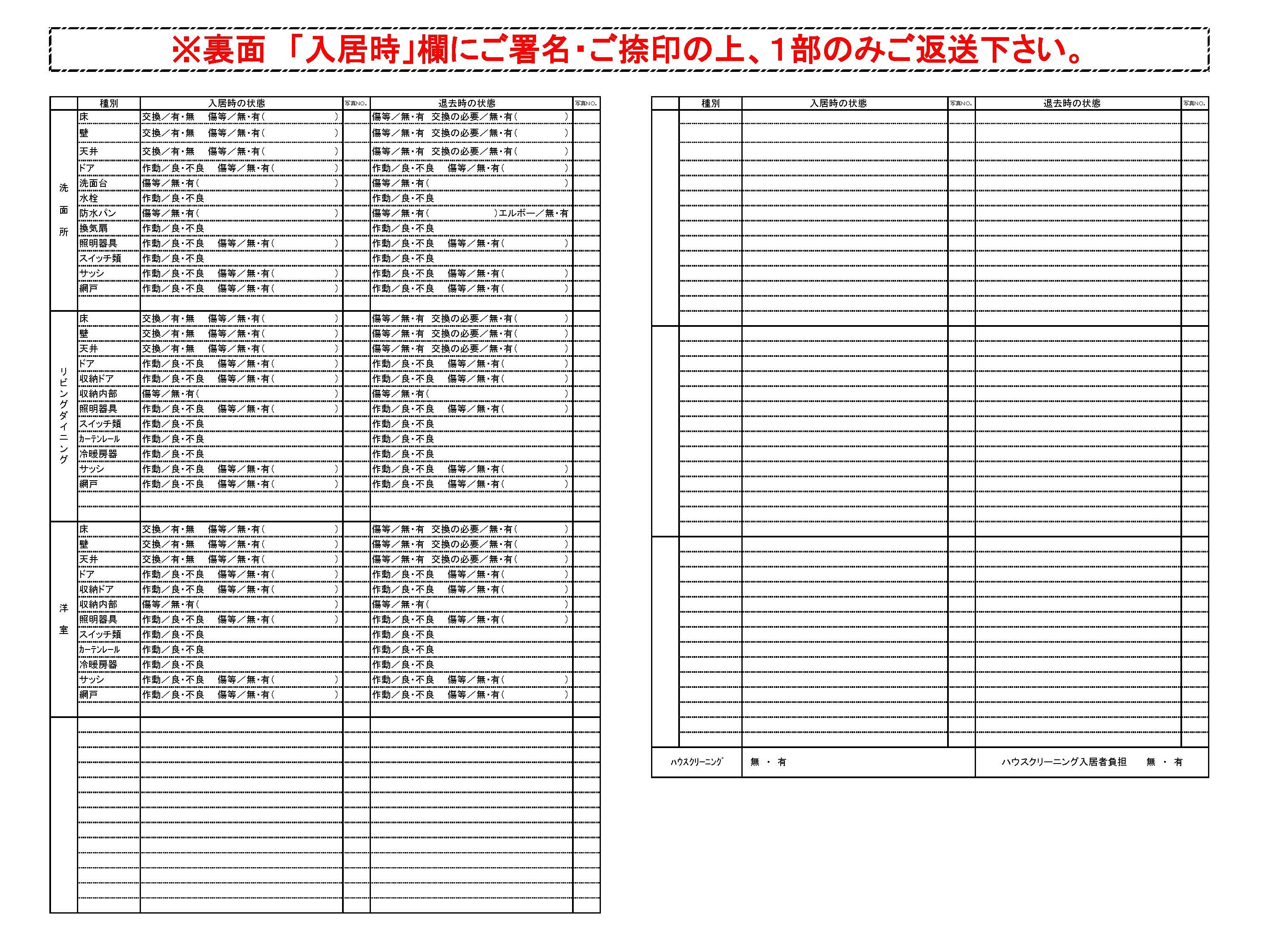 - 入居時の室内状態を書面で把握・履歴化でき、解約の際の重要な資料として活用いただけます。